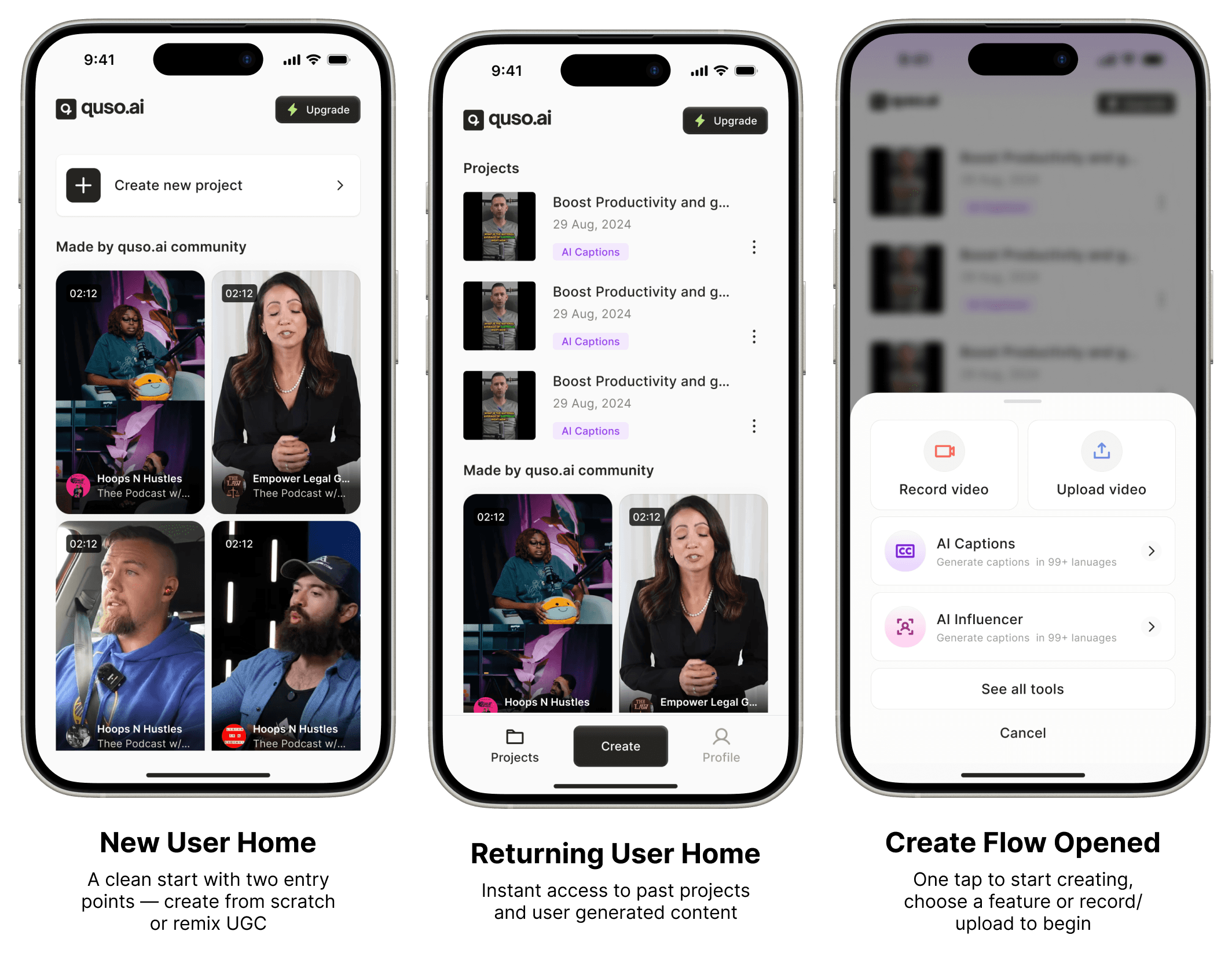 When quso.ai set out to bring its full suite of AI tools to mobile, we quickly realized shipping everything at once would slow us down and likely miss the mark. So we stripped it down to just one high-impact feature: AI Captions. This case study walks through how we turned that narrow scope into a fast, focused MVP, and how I led the end-to-end design to learn quickly, validate real behavior, and pave the way for quso.ai’s mobile roadmap.