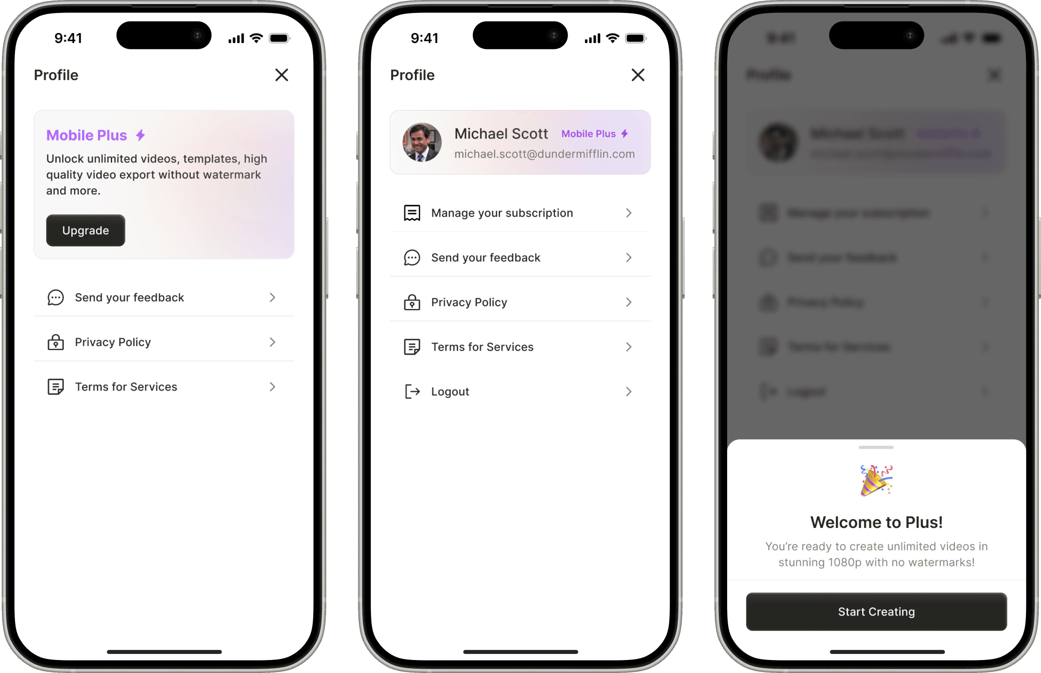 I kept the profile screen simple on purpose, focused only on what mattered: managing plans and accounts. Since login wasn’t needed for the first 5 videos, most users didn’t need to interact with it early on.
